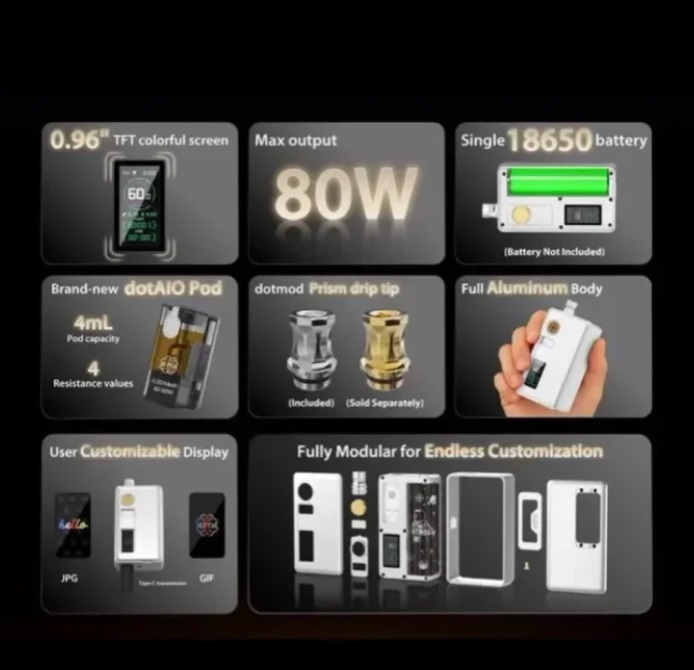 The dotAIO V3 is engineered for flexibility and precision. Its chipset provides precise wattage control in 0.1W increments up to 80W, multiple power modes, and a refined auto mode with tailored strength settings. Whether you prefer mouth-to-lung (MTL) or direct-lung (DL) performance, the V3 adapts seamlessly to your style. Powered by a single 18650 battery ( sold separately ), the dotAIO V3 delivers all-day power in a compact, portable form factor.